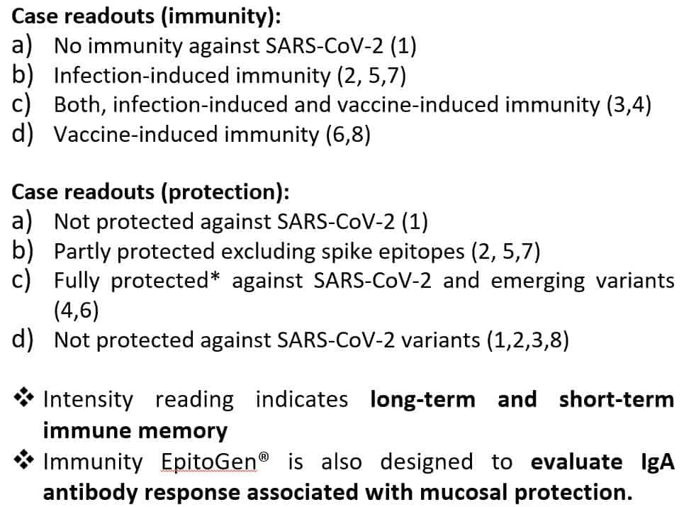 Immunity EpitoGen® can be used before & after SARS-CoV-2 infection and/or vaccination to provide a readout of immunity against further infection by the reference strain or mutated variants.